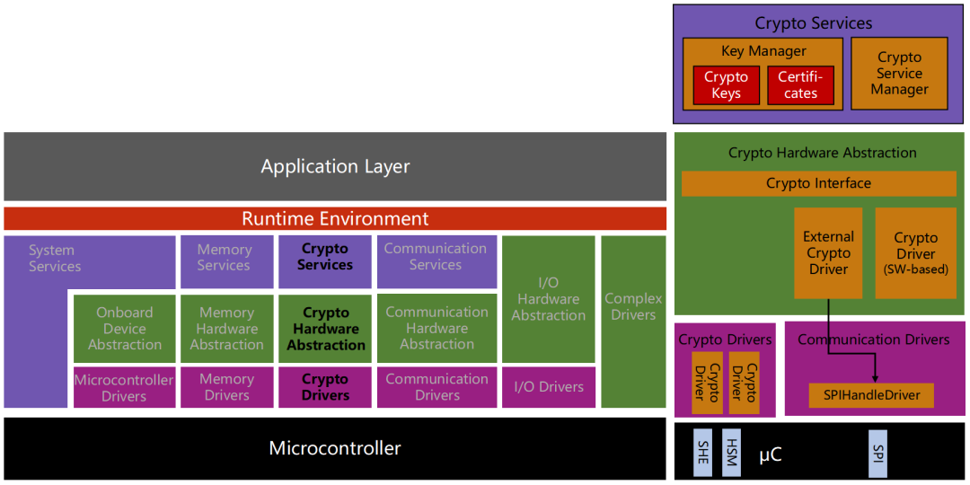 1. Crypto(HW based):硬件加密模块的驱动程序,用于控制HSM(Hardware Security Module)或SHE(Security Hardware Extensions),和具体芯片有关。