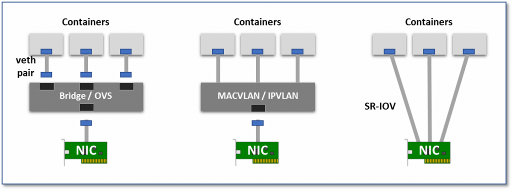 多路复用:使用一个中间网络设备,暴露多个虚拟网卡接口,容器网卡都可以介入这个中间设备,并通过 MAC/IP 地址来区分 packet 应该发往哪个容器设备。