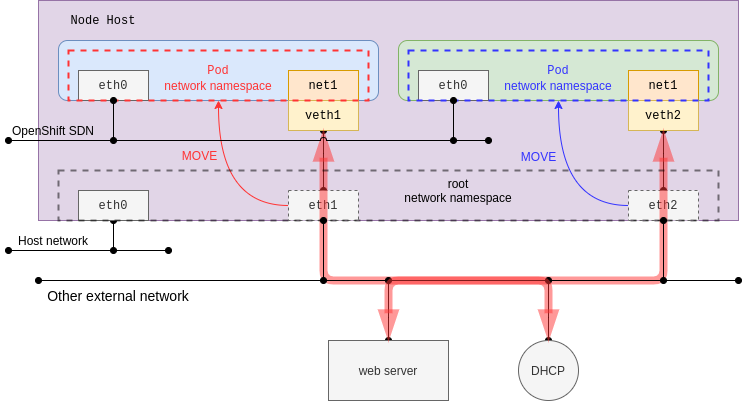 于此同时,也可以将主机接口直接移动到 Pod 的网络名称空间,当然这个接口是必须存在,并且不能是与默认网络使用同一个接口。这种情况下,在普通网卡的环境中,就直接将 Pod 网络与 Node 网络处于同一个平面内了。