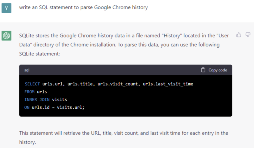 一个很好的关于ChatGPT的DFIR测试,是要求ChatGPT写一个SQLite语句来解析谷歌浏览器的历史记录。提出这个建议的专家说,"ChatGPT做了正确的连接,但除此之外都是基本的语句"。