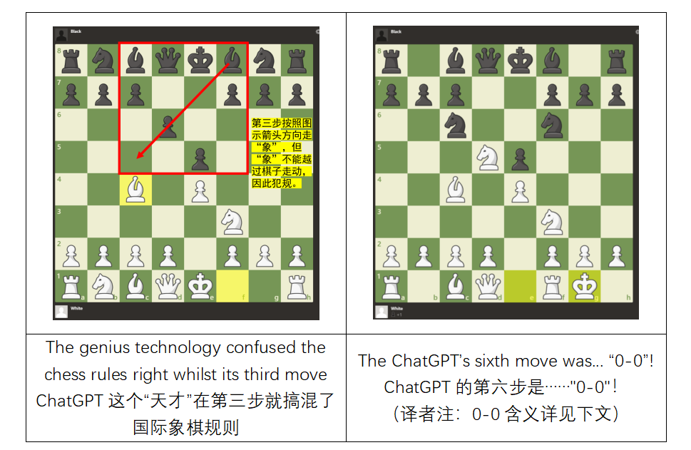 我下了0-0,ChatGPT也下了。这时事情变得更加有趣了。我决定不指出非法棋步,而是问:“你的象在哪里?” ChatGPT回答说它没有下象,并道歉了两次。我更直接地问:"你能用f8的象下0-0吗?" ChatGPT回答说,解释了 "0-0 "符号的含义。(译者注:0-0,代表“王车易位”,走法是:首先由“王”向“车”的方向走两格,再把“车”越过“王”放在与王相邻的一格上,其视为“王”的一步棋,是国际象棋中的一种特别的走法。记谱时写作0-0,某些时候也写做大写字母O-O,读作“短易位”。)
