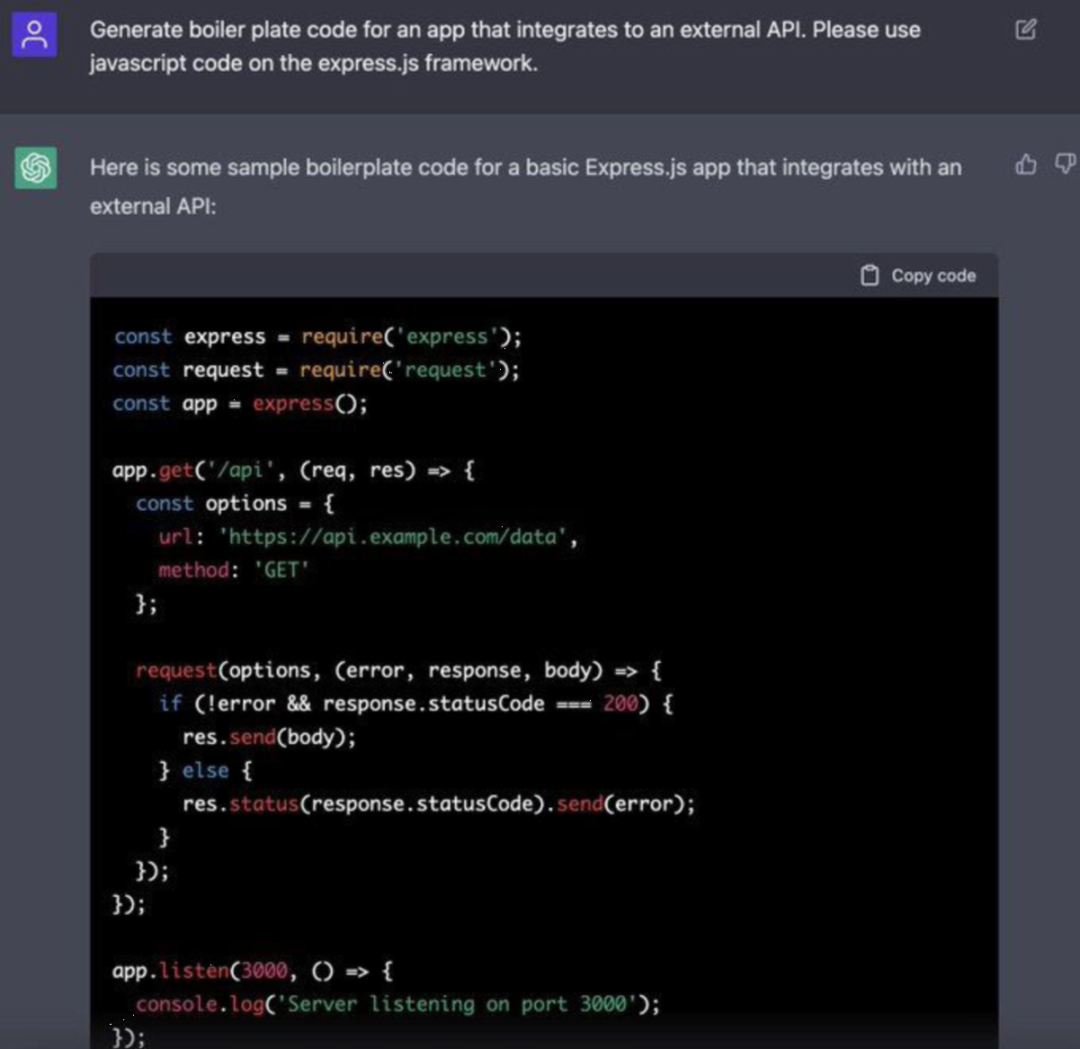 例如,浏览一下ChatGPT基于文本规范生成的代码会有一些启发:
