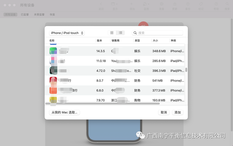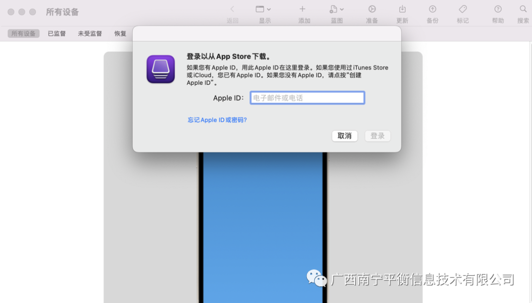 下载后用数据线连接iPhone到Mac电脑,点击运行Apple Configurator 。在“Apple Configurator”应用界面选择“添加”-“App”,然后输入iPhone登录的Apple ID。