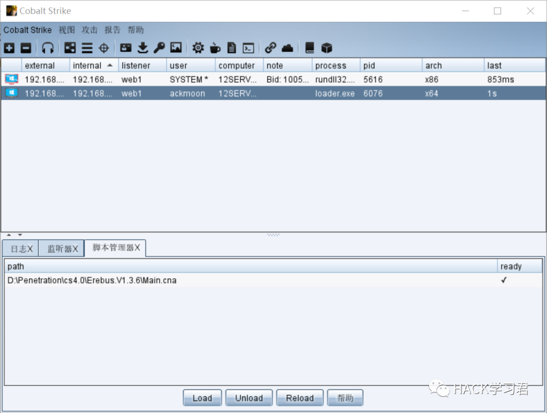 然后生成木马,在 web2 运行后 cs 成功上线(电脑太卡啦,web1 被我挂起了所以会话没了)