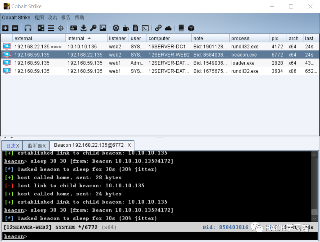 cs 创建监听器,payload 选 Beacon TCP,生成无状态木马并上传到 web2 运行,在跳板机会话中执行 connect 192.168.22.135 2333,web2 正向连接上线,但是会话不稳定总是上线又下线,又试了一下 goproxy 把流量代出来,这样就非常稳定了