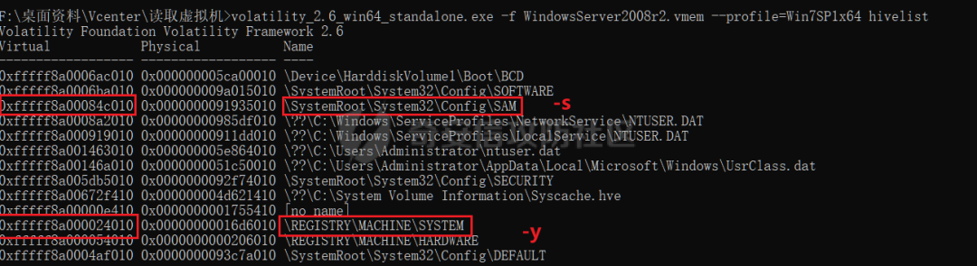 volatility_2.6_win64_standalone.exe -f WindowsServer2008r2.vmem --profile=Win7SP1x64 hivelist