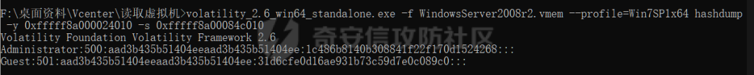 volatility_2.6_win64_standalone.exe -f WindowsServer2008r2.vmem --profile=Win7SP1x64 hashdump -y 0xfffff8a000024010 -s 0xfffff8a00084c010