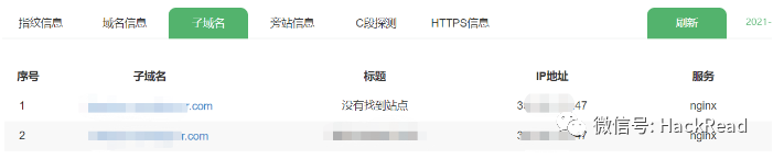那接着继续信息搜集,这里首先使用的是Tide团队的潮汐在线指纹识别,看了下子域名和旁站信息,资产还不少。PS:项目关系,这里截图只截图部分。