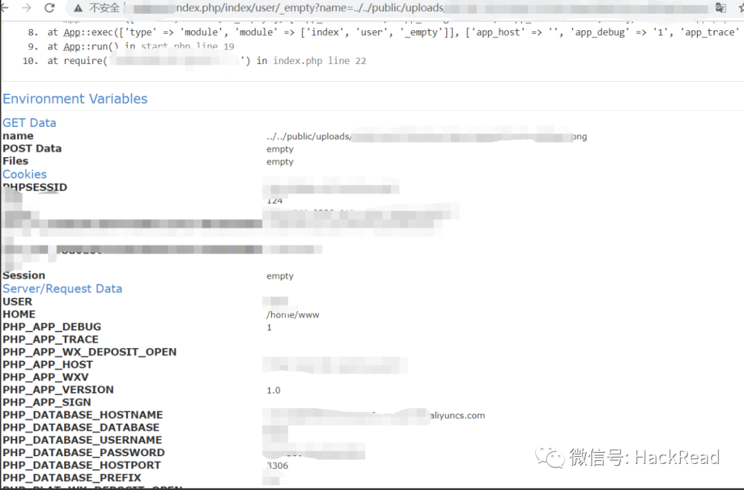 访问FastAdmin站点,眼前一亮,祖师爷赏饭吃啊,基本是默认的FastAdmin Demo页面,开启了注册。于是上传图片马,访问/fastadmin/public/index/user/_empty?name=../../public/uploads/20210116/4a91d432904c0042bcd038ea96ad4947.jpg,emm,当时僵硬了0.5秒,访问后并不是自己的小马,而是DEBUG页面,这站居然是调试模式。。。