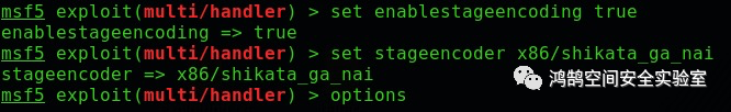 但是,在不使用其他模块的情况下,有一个选项可以隐藏我们正在下载包含Meterpreter的二进制文件这一事实,使用我们的multi/handler模块上的以下选项,命名为stageencoderenablestageencoding,我们将在下一个测试中使用如下。