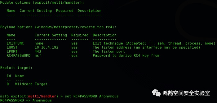 正如我们所看到的,这些选项是常用的,唯一需要的额外选项是密码,可以使用命令“set RC4PASSWORD yourpassword”来设置