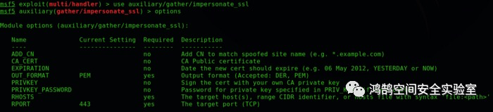 要使用不同的证书,作为攻击者,我们可以购买一个或使用自签名证书,但Metasploit包含一个名为impersonate_ssl的有用辅助模块,我们可以在其中提供不同的设置来创建假证书: