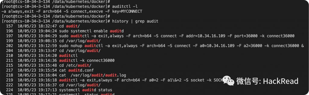 k8s的容器数量众多,一台主机运行几百个容器,逐个排查效率太低。既然确定异常ssh的登录记录在每天凌晨会固定出现。所以直接开启auditd进行网络请求和命令的审计。命令如下: