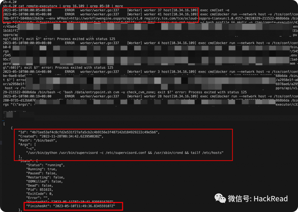进入该容器查找服务器日志,发现下发命令的时间与ssh报错的时间和次数完全一致,确实是该容器的服务下发命令导致ssh登录异常。