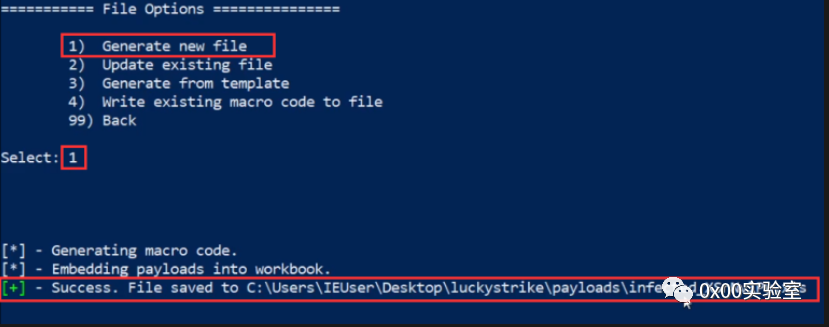 我们现在可以通过导航回 Luckystrike 主菜单并选择“文件选项”菜单选项来生成恶意文档,如下面的屏幕截图中突出显示的那样。![]()