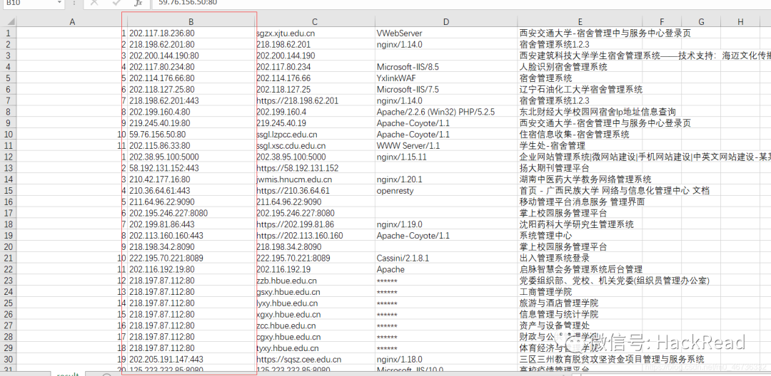 因为要使用Rad爬虫,所以我们要对资产进行整理,要使他符合Rad的规则。我们要把上图红框框里的IP加上http://或者https://,我记得之前学校有考过一个题,就是在excel表中批量给单元格加同样的内容,不过我忘了,这里就用python解决好了,脚本如下