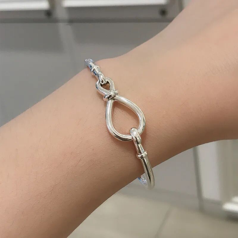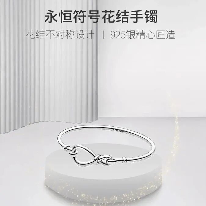 永恒符号花结手镯,采用优质925银为材料,核心装饰为环绕一圈的“永结同心”的卡扣式按钮,迸发无穷爱意,是每个女生都拒绝不了的一款手镯。