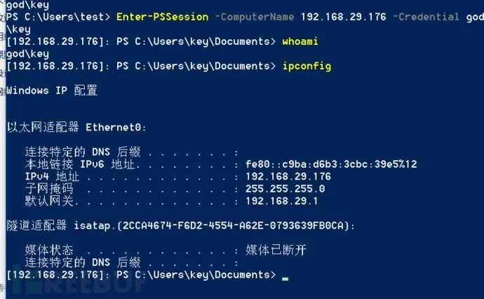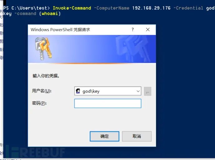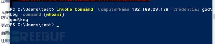 Invoke-Command -ComputerName 192.168.29.176 -Credential god\key -command {whoami}实例3: