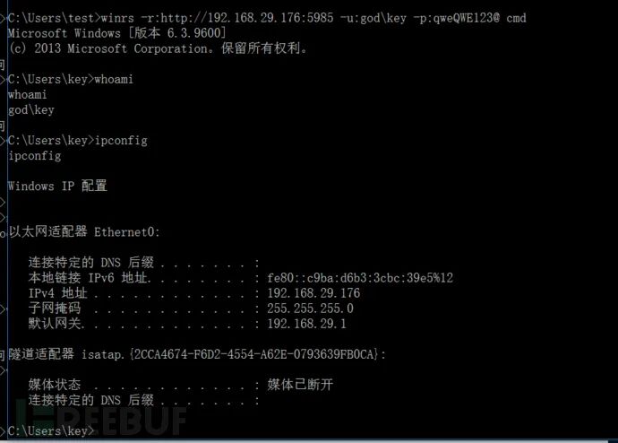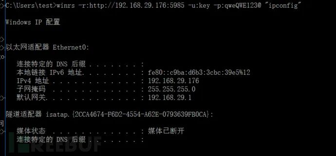 winrs -r:http://192.168.29.176:5985 -u:key -p:[email protected] "ipconfig"实例3: