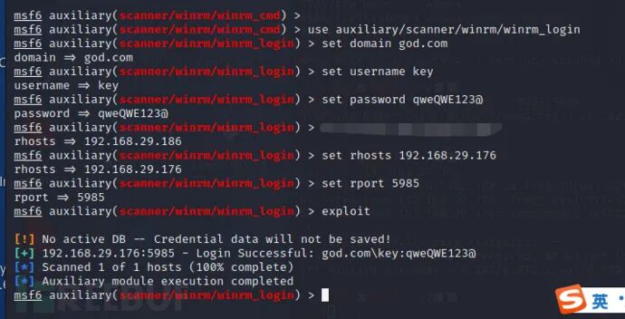 auxiliary/scanner/winrm/winrm_loginset domain god.comset username keyset password [email protected]set rhosts 192.168.29.176set rport 5985