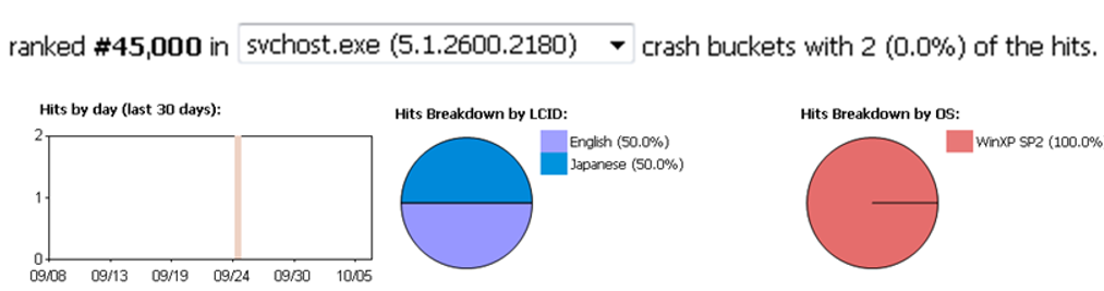 9月25日,一个崩溃事件引起了我的注意--netapi32.dll中的一个漏洞。这本身并不罕见。在MS06-040中,我们修复了netapi32!NetpwPathCanonicalize 中的缓冲区溢出漏洞。每天会有来自僵尸网络的数百万次崩溃崩溃进来,企图利用这个漏洞(因为/GS的原因而失败)来感染易受攻击的PC。这个新的崩溃事件出现在非常相似的代码中,但在不同的WER桶(bucket)中。它既不是前100个问题中的问题,也不是前1000个问题中的问题。它是第45000个问题,历史上只出现过2次。这是在长尾上生存的典型数据。