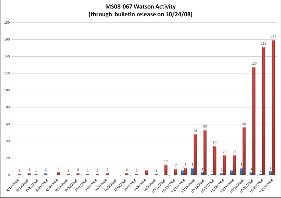 我们正在争分夺秒地扑灭一个火灾,以免火势让事态恶化,而Windows更新就像是我们的消防水带。构建Windows更新的工程师们建立了一个惊人的预防系统。虽然我们观察到的都是有针对性的攻击,但我们知道蠕虫随时可能被释放,使用数以亿计的易受攻击的系统作为氧气。MSRC利用了所有可以用来告知客户的方式,以便进行补丁更新。在一周内,Windows Update向4亿台个人电脑提供了补丁更新,并向公司防火墙后面的数百万更多系统进行了更新。我想不出还有哪个系统能以同样的速度更新4亿个任何东西。询问任何人对MS08-067的了解,大多数人都会提到Conficker。到10月份,Conficker甚至还不存在。虽然Conficker非常具有破坏力,但它只影响了未进行补丁更新的电脑。现在想象一下,如果Conficker还有数十亿个系统进行感染会发生什么。