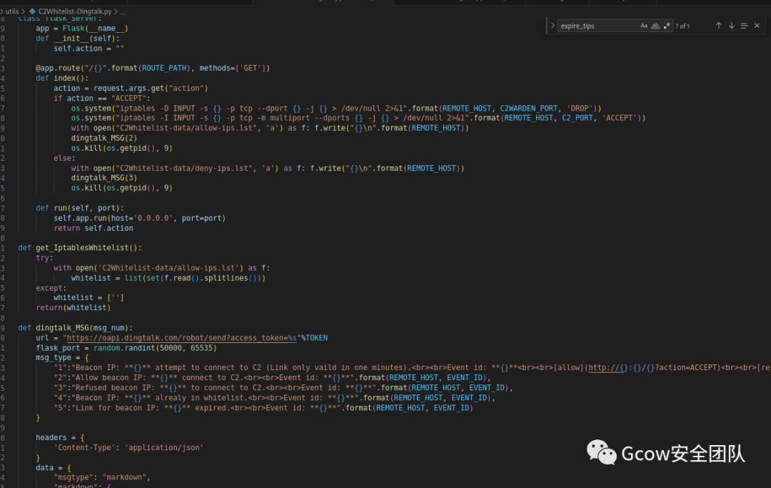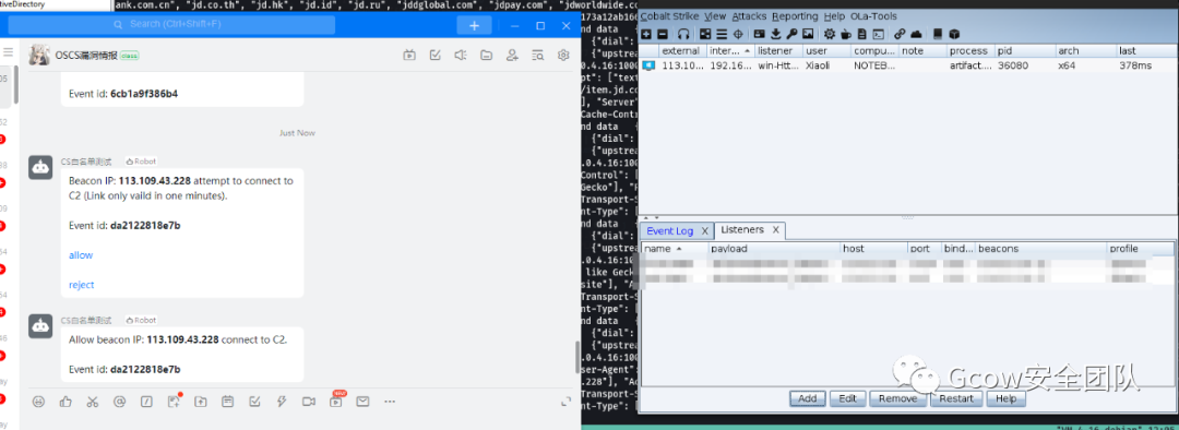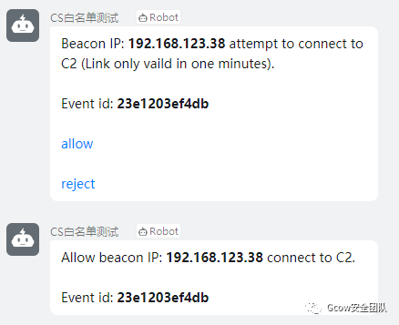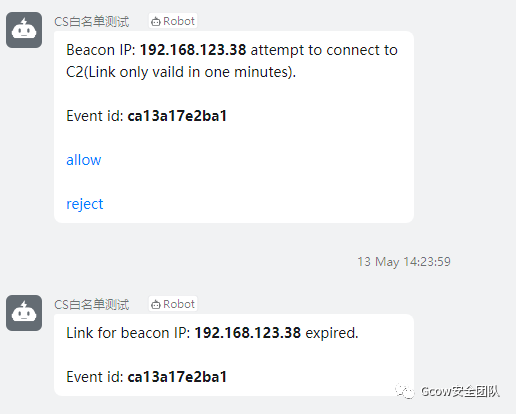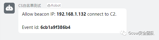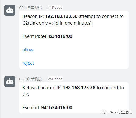 1、实现:目标机器触发请求到前置代理,前置代理执行脚本发送信息到钉钉机器人问你是否上线,期间会有60秒冗余时间让你选择,60秒内,目标机器的流量将会进入拒绝模式,防止蓝队人员进行扫描,爆破,在60秒内,你在钉钉将会收到上线信息,如果超过60秒,该IP的流量将不会继续拦截(依旧不能上线CS),意味着你还能继续发送上线申请