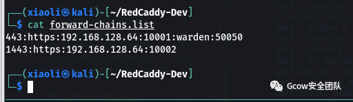 2、指定转发链文件,流量从哪进来,转发到哪,如下图所示,流量从443进来,转发到192.168.128.64:10001(c2 backend,默认的话一般写你 ifconfig看到的ip),同时关键字warden表示该端口同时用作Teamserver端口保护的开关(反向代理),50050表示你的teamserver端口
