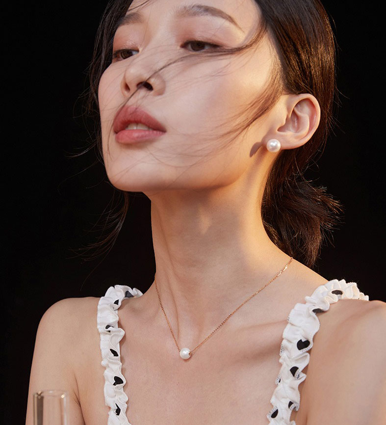 珍珠耳钉秀气雅致,珍珠项链也精巧温柔,落入耳间、颈间,仿佛被散落人间的星河亲吻,灵气逼人。