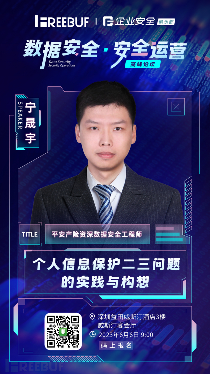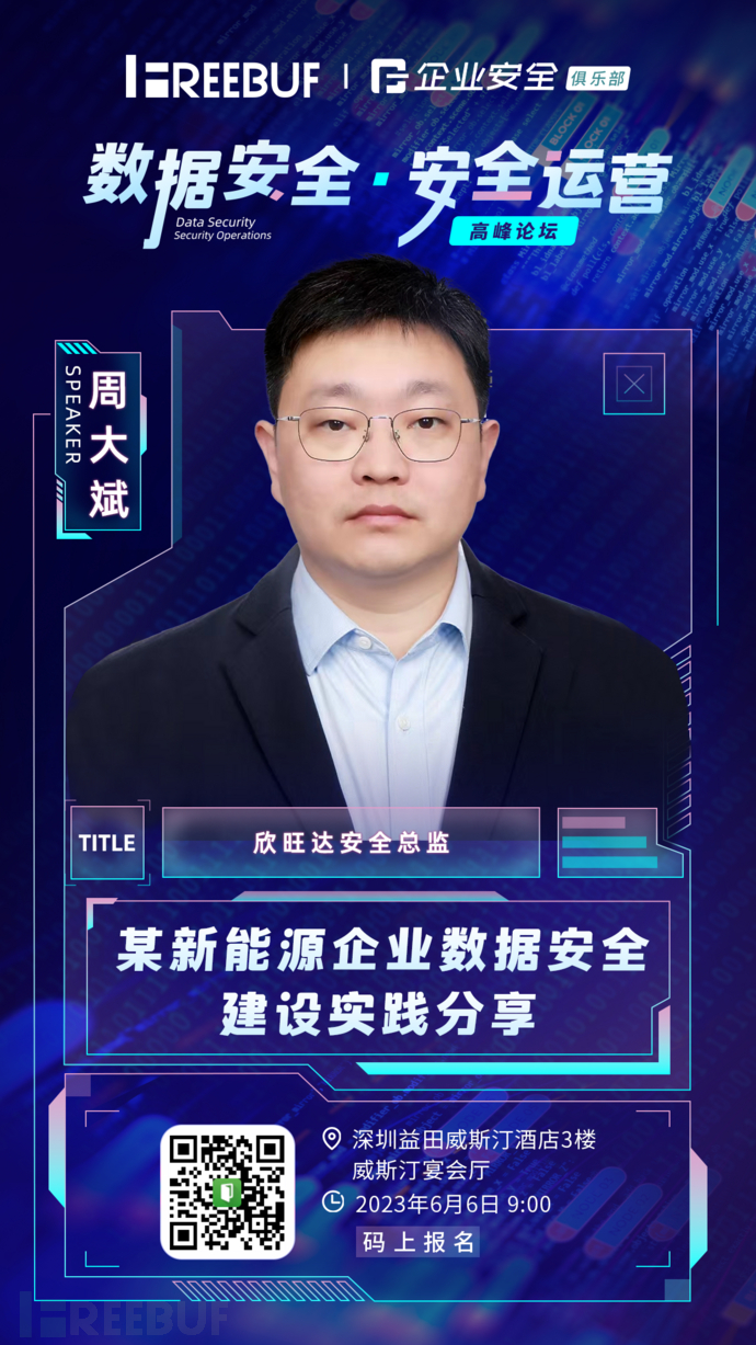 在如此严峻形势背景下,即将于2023年6月6日举办的FreeBuf企业安全俱乐部·深圳站活动将聚焦数据安全,来自欣旺达安全总监周大斌、平安产险的资深数据安全工程师宁晟宇将分别以某新能源企业数据安全建设实践分享、个人信息保护二三问题的实践与构想为主题演讲,就数据安全相关实践痛点展开讨论。