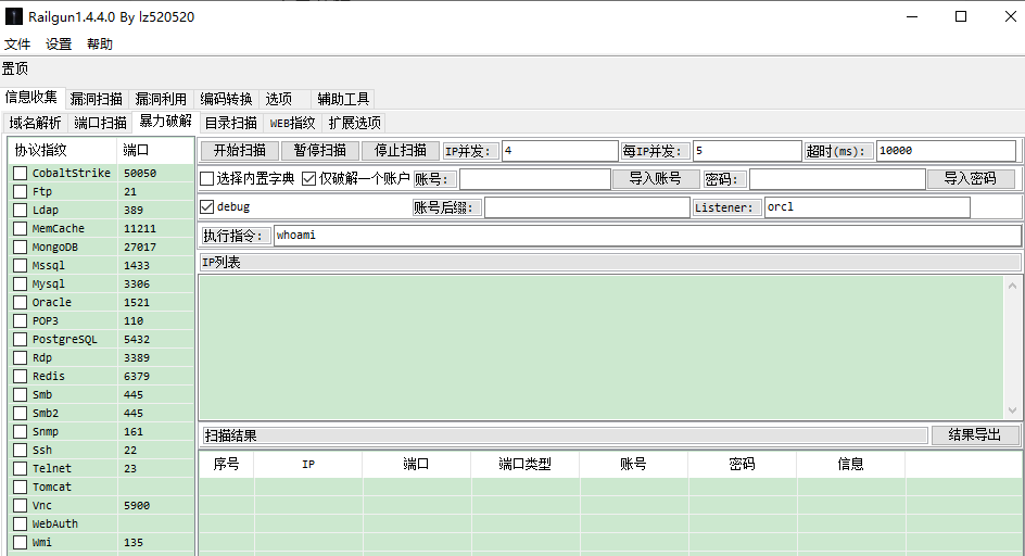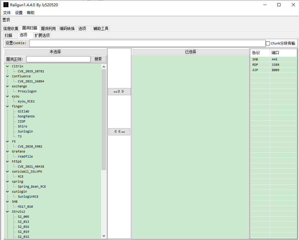 Railgun为一款GUI界面的渗透工具,将部分人工经验转换为自动化,集成了渗透过程中常用到的一些功能,目前集成了端口扫描、端口爆破、web指纹扫描、漏洞扫描、漏洞利用以及编码转换功能,后续会持续更新。