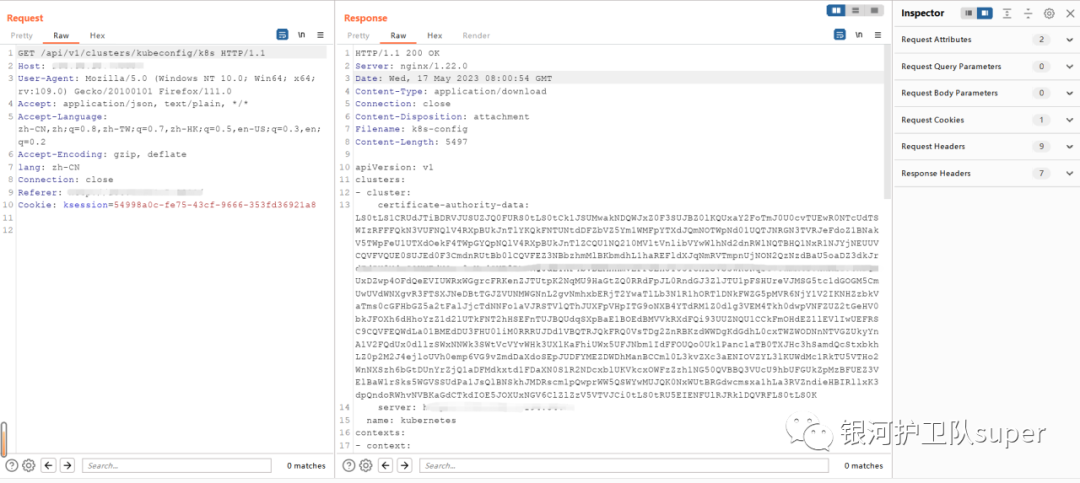 当集群存在时可通过接口未授权下载配置文件,下图可以看到集群名称为k8s