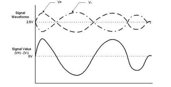逻辑 0 和逻辑 1。见图,它使用了 V+ 与 V-信号的差值表达出了图下方的信号。