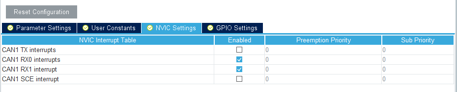 static void MX_CAN1_Init (void ) { /* USER CODE BEGIN CAN1_Init 0 */ /* USER CODE END CAN1_Init 0 */ /* USER CODE BEGIN CAN1_Init 1 */ /* USER CODE END CAN1_Init 1 */ hcan1.Instance = CAN1; hcan1.Init.Prescaler = 12 ; hcan1.Init.Mode = CAN_MODE_NORMAL; hcan1.Init.SyncJumpWidth = CAN_SJW_1TQ; hcan1.Init.TimeSeg1 = CAN_BS1_4TQ; hcan1.Init.TimeSeg2 = CAN_BS2_2TQ; hcan1.Init.TimeTriggeredMode = DISABLE; hcan1.Init.AutoBusOff = ENABLE; hcan1.Init.AutoWakeUp = ENABLE; hcan1.Init.AutoRetransmission = DISABLE; hcan1.Init.ReceiveFifoLocked = DISABLE; hcan1.Init.TransmitFifoPriority = DISABLE; if (HAL_CAN_Init(&hcan1) != HAL_OK) { Error_Handler(); } /* USER CODE BEGIN CAN1_Init 2 */ bsp_can1_filter_config(); HAL_CAN_Start(&hcan1); HAL_CAN_ActivateNotification(&hcan1,CAN_IT_RX_FIFO0_MSG_PENDING); /* USER CODE END CAN1_Init 2 */ }下面我们来编写下中断函数