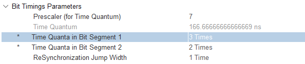 本成员可以配置 SJW 的极限长度,即 CAN 重新同步时单次可增加或缩短的最大长度,它可以被配置为 1-4Tq(CAN_SJW_1/2/3/4tq)。