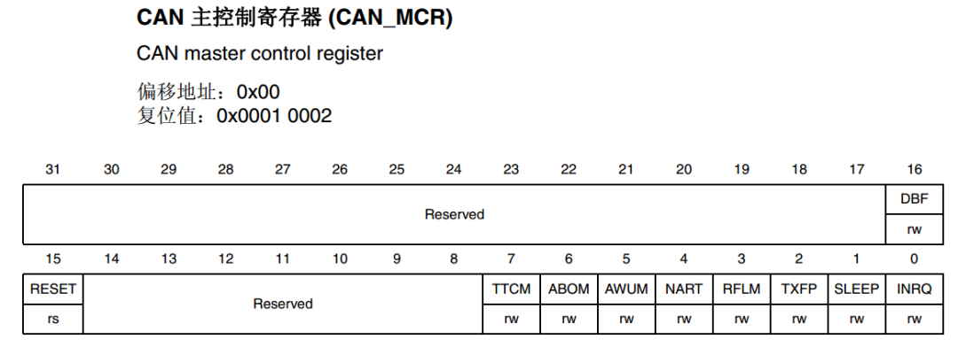 2.1.1 主控制寄存器 CAN_MCR 主控制寄存器 CAN_MCR 负责管理 CAN 的工作模式,它使用以下寄存器位实现控制。