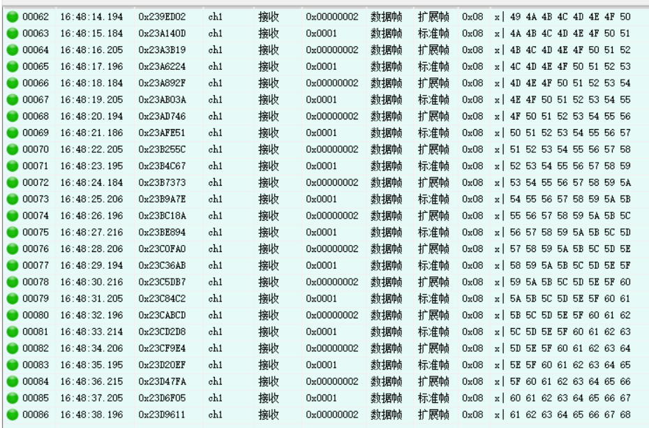 send_data[0 ]++; send_data[1 ]++; send_data[2 ]++; send_data[3 ]++; send_data[4 ]++; send_data[5 ]++; send_data[6 ]++; send_data[7 ]++;if (id_type_std == 1 ) { bsp_can1_send_msg(CAN_ID_STD,1 ,2 ,send_data,8 ); id_type_std = 0 ; }else { bsp_can1_send_msg(CAN_ID_EXT,1 ,2 ,send_data,8 ); id_type_std = 1 ; } HAL_Delay(1000 );我们通过CAN协议分析仪来抓下结果
