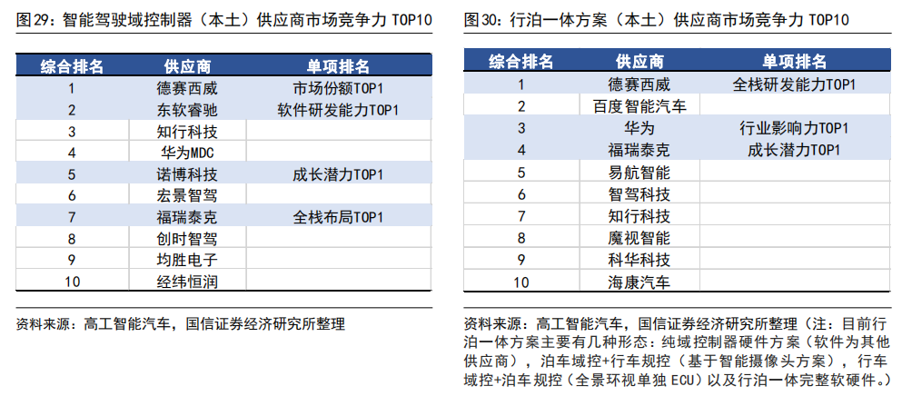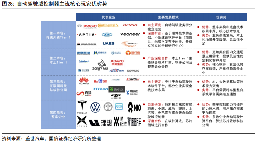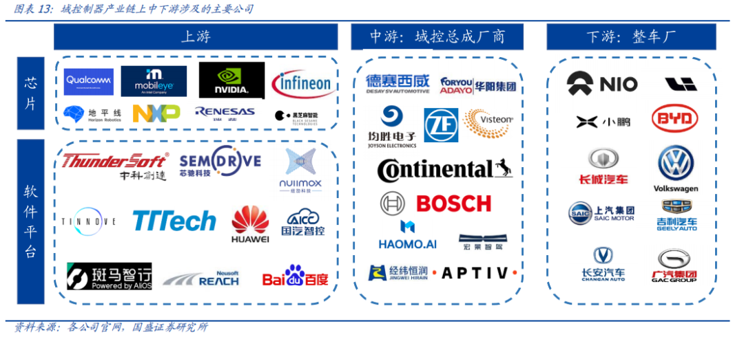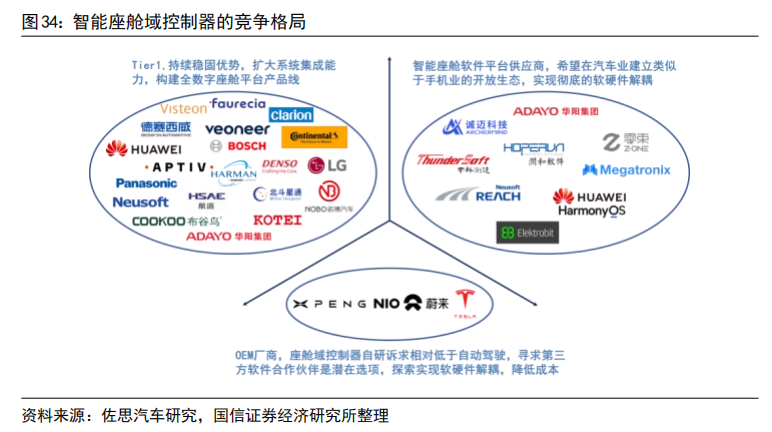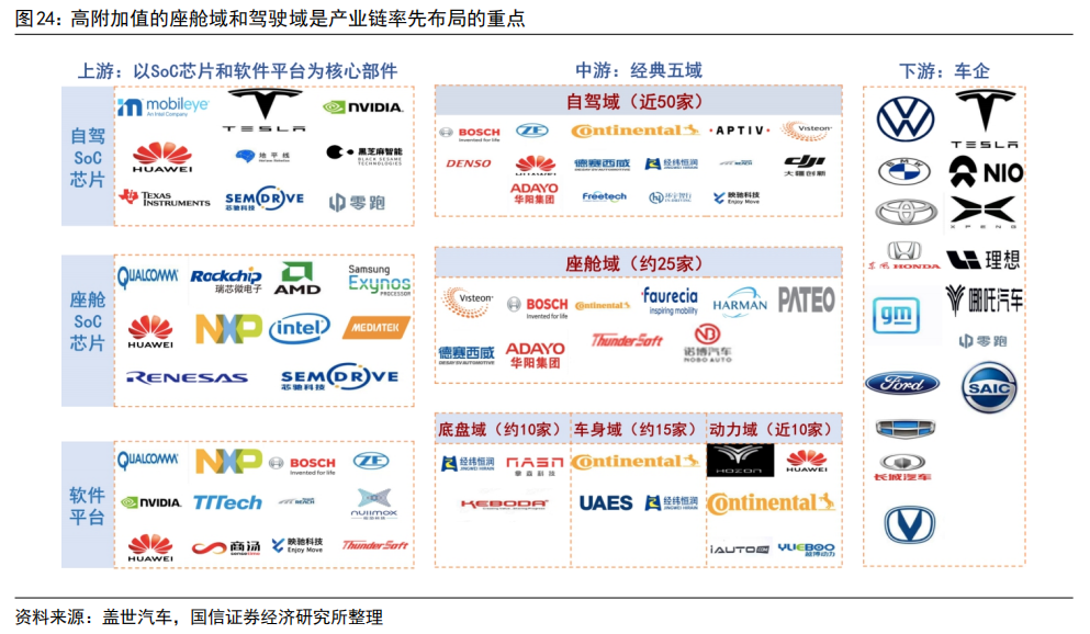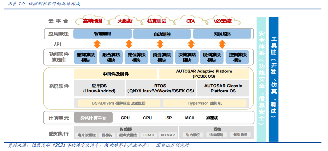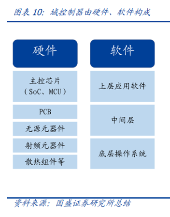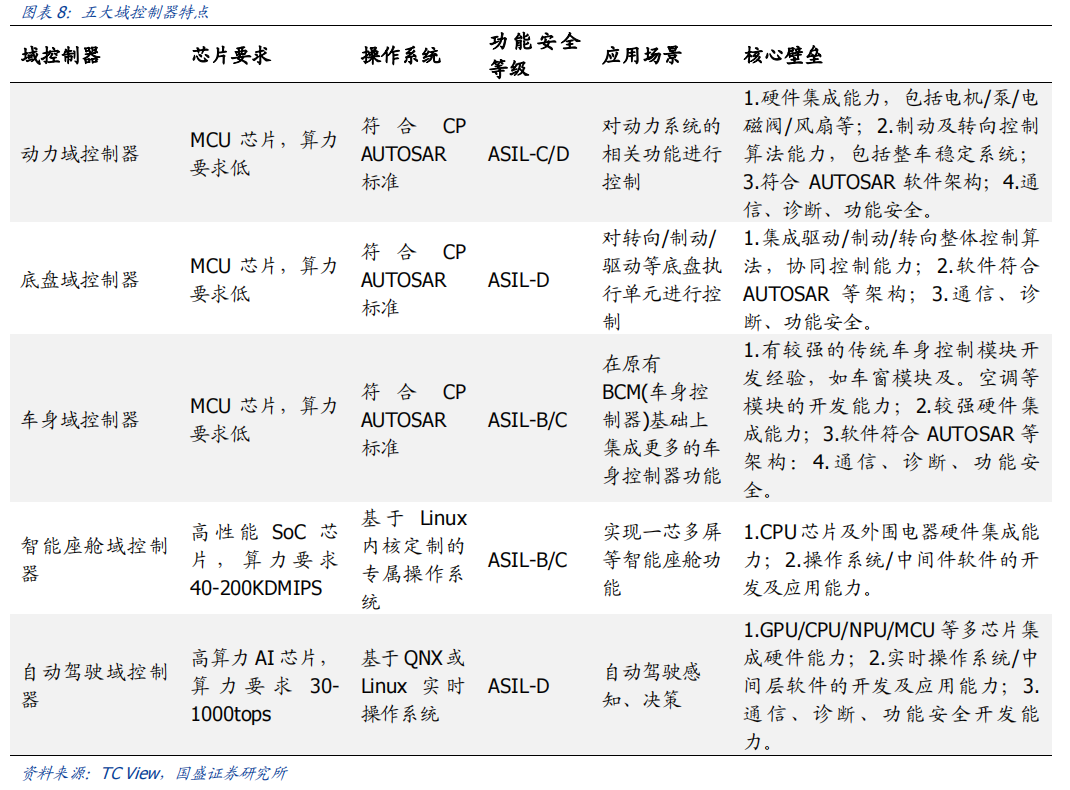 自动驾驶域能够使车辆具备多传感器融合、定位、路径规划、决策控制、图像识别、高速通讯、数据处理的能力。自动驾驶域通常需要外接多个摄像头、毫米波雷达、激光雷达等等车载传感器来感知周围环境,通过传感器数据处理及多传感器信息融合,以及适当的工作模型制定相应的策略,进行决策与规划。域控制器的输入为各项传感器的数据,所进行的算法处理涵盖了感知、决策、控制三个层面,最终将输出传送至执行机构,进行车辆的横纵向控制。自动驾驶域所集成的功能基本不涉及机械部件,且与座舱域交互密切,并和智能座舱域一样需要处理大量数据,对算力要求较高,因此需要匹配核心运算力强的芯片,来满足自动驾驶的算力需求,简化设备,大大提高系统的集成度。车身域将集成传统 BCM 功能和空调风门控制、胎压监测、PEPS、网关等功能,未来率先与智能座舱域融合。传统的车身控制器(BCM)功能主要包括内/外部车灯、雨刮、车窗、车门、电子转向锁等的控制,通过CAN/LIN与各个小节点进行通讯,节点较多,线束设计、软件控制逻辑均较复杂。而车身域控制器对车身节点实现了功能和零部件的集成,对于各个车身电子进行集中控制,对采集到的信息进行统一的分析和处理,效率更高;技术上,车身域控制器要求传统 BCM 开发经验、硬件集成能力、软件架构能力、芯片保供能力,未来将集成网关以及一些低等级 ADAS 功能,并率先与智能座舱域实现融合。其中,智能座舱域、自动驾驶域是现阶段承载整车个性化智能体验的关键所在,也是目前车企的竞争焦点和布局重点。这两个域最能在整车端体现品牌的智能化差异,同时对传统功能系统供应链依赖度小;在现阶段迭代最快,其功能开发和实现需要涉及大量AI 运算,因此对芯片所提供算力、操作系统底层算法要求很高;而其他域控制器涉及整车安全的部件较多,因此对功能安全等级要求更高,对芯片算力要求和功能智能化程度相对较低。从供应端来看,在汽车整体分布式架构集中化的进程中,由中控系统升级而来的智能座舱域与新兴的自动驾驶域的供应体系较为完整;而其他域则是对传统功能系统的进一步集成,涉及的供应商繁多,更容易产生利益冲突,且随着电子模组件实现规模生产后的降价趋势,未来价值增量有限。未来,底盘域、动力域、车身域有望进一步集成,按照车身区域进行“区域域”集成,向车辆集中式架构进一步发展。从结构上来看,域控制器主要由硬件(主控芯片和元器件等)和软件(底层基础软件、中间件以及上层应用算法)构成,其功能的实现主要来自于主控芯片、软件操作系统及中间件、应用算法软件等多层次软硬件之间的有机结合。1)域控制器硬件主要包括主控芯片、PCB 板、电阻电容等无源元器件、射频元器件、支架、散热组件、密封性金属外壳等部分,其中主控芯片是核心部件。目前来看,对算力要求较高的智能座舱域和自动驾驶域所使用的主控芯片普遍由提供控车功能的MCU 芯片和包括中央处理器 CPU、图像处理器 GPU、音频处理器 DSP、深度学习加速单元 NPU、图像信号处理器 ISP、应用型专用集成芯片 ASIC、半定制电路芯片 FPGA 等部件的 SoC 芯片来共同提供所需算力,以支撑各种场景下的硬件加速需求。而底盘域、车身域、动力域由于相对较低的算力要求和成本考量,其主控芯片仍然多为较为传统的MCU 芯片。预计主控芯片的未来趋势会走向单独使用更高算力的 SoC 芯片。2)软件主要包括底层操作系统、中间件和开发框架、上层应用软件层。底层操作系统包括基础汽车操作系统、定制操作系统、虚拟机、系统内核等。中间层和开发框架包括AP AutoSar、SOA 等,处于底层操作系统与上层应用软件之间,为应用软件功能实现层屏蔽掉特定处理器和底层操作系统相关的细节,并实现与车辆网络、电源等系统交互所需的基础服务。上层应用软件层包括智能座舱 HMI、ADAS/AD 算法、网联算法、云平台等,实际实现对于车辆的控制与各种智能化功能。其中,预计底层操作系统将是众多Tier1 的发力重点,而上层应用软件层、中间层将是是各整车厂重点研发打造差异化的领域。硬件部分,最核心的主控芯片包括 SoC 芯片和 MCU 芯片,其中 SoC芯片的主要供应商包括海外的Mobileye、高通、英伟达等厂商和国内的地平线、黑芝麻、华为等厂商,MCU 芯片的主要供应商包括恩智浦、英飞凌、瑞萨等传统 MCU芯片巨头;软件部分,底层操作系统的国内主要供应商包括国汽智控、华为、百度斑马智行等,中间层的主要供应商包括 EB、Vector、TATA、Mentor、ETAS、KPIT 等传统供应商和 TTTech、未动科技、纽劢科技、中科创达、东软瑞驰、映驰科技等国内新兴供应商。低算力座舱芯片格局较为分散,除 NXP、瑞萨、德州仪器等传统车载 SoC 厂商外,高通、英特尔、英伟达、华为、AMD、联发科等消费电子领域芯片厂商也在积极进驻。国内芯片企业如杰发科技、芯驰科技、瑞芯微、地平线、芯擎科技等也通过自主造芯之路加入混战,重塑汽车芯片产业格局。国外 Tier1 供应商主要包括博世、伟世通、德尔福、大陆、采埃孚等国际巨头,国内 Tier1 供应商包括德赛西威、科博达、华阳集团、均胜电子、经纬恒润等。目前智能座舱域控制器参与方主要包括整车厂、域控制器总成厂商与软件开发公司。其中,整车厂与软件开发公司多专注于软件
