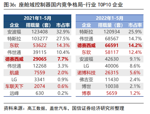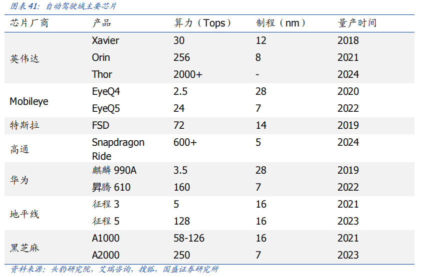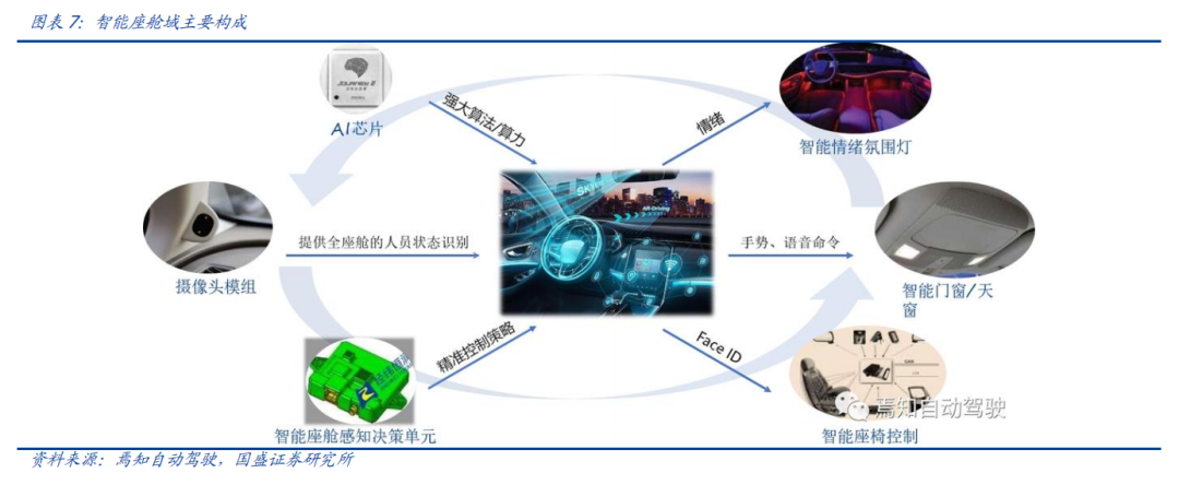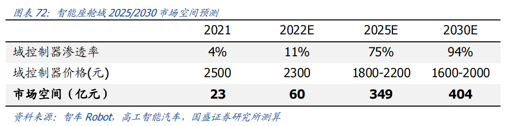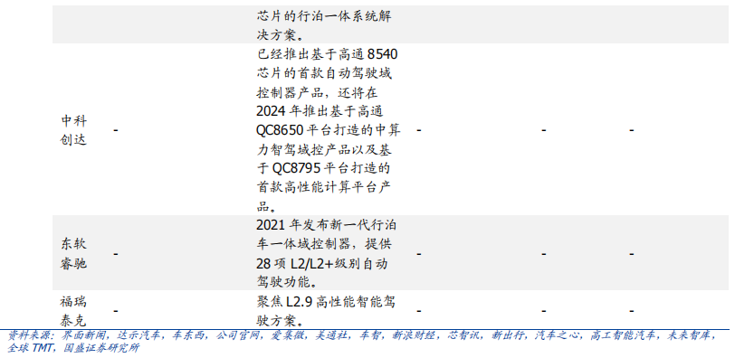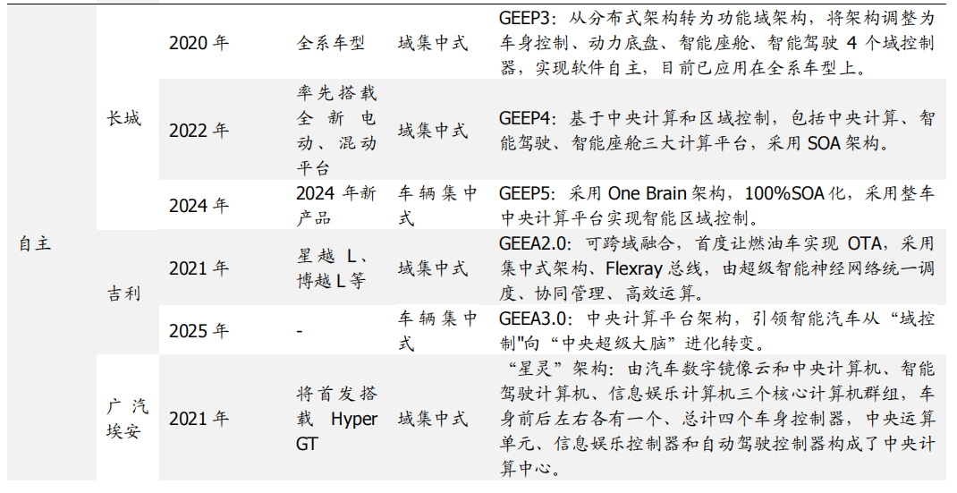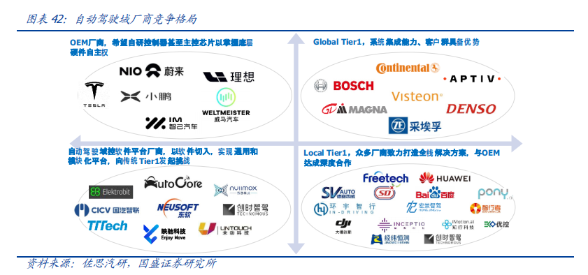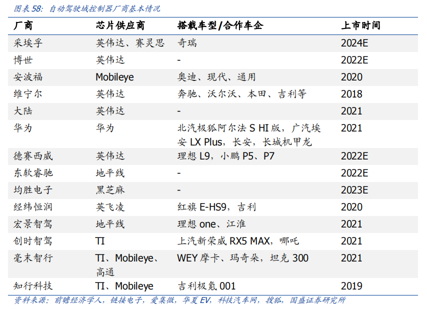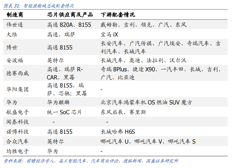 自动驾驶域能够使车辆具备多传感器融合、定位、路径规划、决策控制、图像识别、高速通讯、数据处理的能力。自动驾驶域通常需要外接多个摄像头、毫米波雷达、激光雷达等等车载传感器来感知周围环境,通过传感器数据处理及多传感器信息融合,以及适当的工作模型制定相应的策略,进行决策与规划。域控制器的输入为各项传感器的数据,所进行的算法处理涵盖了感知、决策、控制三个层面,最终将输出传送至执行机构,进行车辆的横纵向控制。自动驾驶域所集成的功能基本不涉及机械部件,且与座舱域交互密切,并和智能座舱域一样需要处理大量数据,对算力要求较高,因此需要匹配核心运算力强的芯片,来满足自动驾驶的算力需求,简化设备,大大提高系统的集成度。车身域将集成传统 BCM 功能和空调风门控制、胎压监测、PEPS、网关等功能,未来率先与智能座舱域融合。传统的车身控制器(BCM)功能主要包括内/外部车灯、雨刮、车窗、车门、电子转向锁等的控制,通过CAN/LIN与各个小节点进行通讯,节点较多,线束设计、软件控制逻辑均较复杂。而车身域控制器对车身节点实现了功能和零部件的集成,对于各个车身电子进行集中控制,对采集到的信息进行统一的分析和处理,效率更高;技术上,车身域控制器要求传统 BCM 开发经验、硬件集成能力、软件架构能力、芯片保供能力,未来将集成网关以及一些低等级 ADAS 功能,并率先与智能座舱域实现融合。其中,智能座舱域、自动驾驶域是现阶段承载整车个性化智能体验的关键所在,也是目前车企的竞争焦点和布局重点。这两个域最能在整车端体现品牌的智能化差异,同时对传统功能系统供应链依赖度小;在现阶段迭代最快,其功能开发和实现需要涉及大量AI 运算,因此对芯片所提供算力、操作系统底层算法要求很高;而其他域控制器涉及整车安全的部件较多,因此对功能安全等级要求更高,对芯片算力要求和功能智能化程度相对较低。从供应端来看,在汽车整体分布式架构集中化的进程中,由中控系统升级而来的智能座舱域与新兴的自动驾驶域的供应体系较为完整;而其他域则是对传统功能系统的进一步集成,涉及的供应商繁多,更容易产生利益冲突,且随着电子模组件实现规模生产后的降价趋势,未来价值增量有限。未来,底盘域、动力域、车身域有望进一步集成,按照车身区域进行“区域域”集成,向车辆集中式架构进一步发展。从结构上来看,域控制器主要由硬件(主控芯片和元器件等)和软件(底层基础软件、中间件以及上层应用算法)构成,其功能的实现主要来自于主控芯片、软件操作系统及中间件、应用算法软件等多层次软硬件之间的有机结合。1)域控制器硬件主要包括主控芯片、PCB 板、电阻电容等无源元器件、射频元器件、支架、散热组件、密封性金属外壳等部分,其中主控芯片是核心部件。目前来看,对算力要求较高的智能座舱域和自动驾驶域所使用的主控芯片普遍由提供控车功能的MCU 芯片和包括中央处理器 CPU、图像处理器 GPU、音频处理器 DSP、深度学习加速单元 NPU、图像信号处理器 ISP、应用型专用集成芯片 ASIC、半定制电路芯片 FPGA 等部件的 SoC 芯片来共同提供所需算力,以支撑各种场景下的硬件加速需求。而底盘域、车身域、动力域由于相对较低的算力要求和成本考量,其主控芯片仍然多为较为传统的MCU 芯片。预计主控芯片的未来趋势会走向单独使用更高算力的 SoC 芯片。2)软件主要包括底层操作系统、中间件和开发框架、上层应用软件层。底层操作系统包括基础汽车操作系统、定制操作系统、虚拟机、系统内核等。中间层和开发框架包括AP AutoSar、SOA 等,处于底层操作系统与上层应用软件之间,为应用软件功能实现层屏蔽掉特定处理器和底层操作系统相关的细节,并实现与车辆网络、电源等系统交互所需的基础服务。上层应用软件层包括智能座舱 HMI、ADAS/AD 算法、网联算法、云平台等,实际实现对于车辆的控制与各种智能化功能。其中,预计底层操作系统将是众多Tier1 的发力重点,而上层应用软件层、中间层将是是各整车厂重点研发打造差异化的领域。硬件部分,最核心的主控芯片包括 SoC 芯片和 MCU 芯片,其中 SoC芯片的主要供应商包括海外的Mobileye、高通、英伟达等厂商和国内的地平线、黑芝麻、华为等厂商,MCU 芯片的主要供应商包括恩智浦、英飞凌、瑞萨等传统 MCU芯片巨头;软件部分,底层操作系统的国内主要供应商包括国汽智控、华为、百度斑马智行等,中间层的主要供应商包括 EB、Vector、TATA、Mentor、ETAS、KPIT 等传统供应商和 TTTech、未动科技、纽劢科技、中科创达、东软瑞驰、映驰科技等国内新兴供应商。低算力座舱芯片格局较为分散,除 NXP、瑞萨、德州仪器等传统车载 SoC 厂商外,高通、英特尔、英伟达、华为、AMD、联发科等消费电子领域芯片厂商也在积极进驻。国内芯片企业如杰发科技、芯驰科技、瑞芯微、地平线、芯擎科技等也通过自主造芯之路加入混战,重塑汽车芯片产业格局。国外 Tier1 供应商主要包括博世、伟世通、德尔福、大陆、采埃孚等国际巨头,国内 Tier1 供应商包括德赛西威、科博达、华阳集团、均胜电子、经纬恒润等。目前智能座舱域控制器参与方主要包括整车厂、域控制器总成厂商与软件开发公司。其中,整车厂与软件开发公司多专注于软件