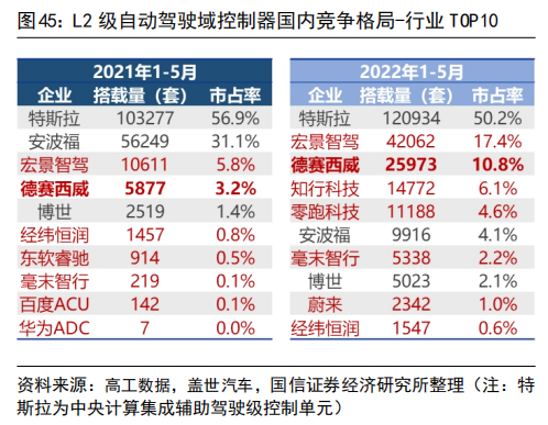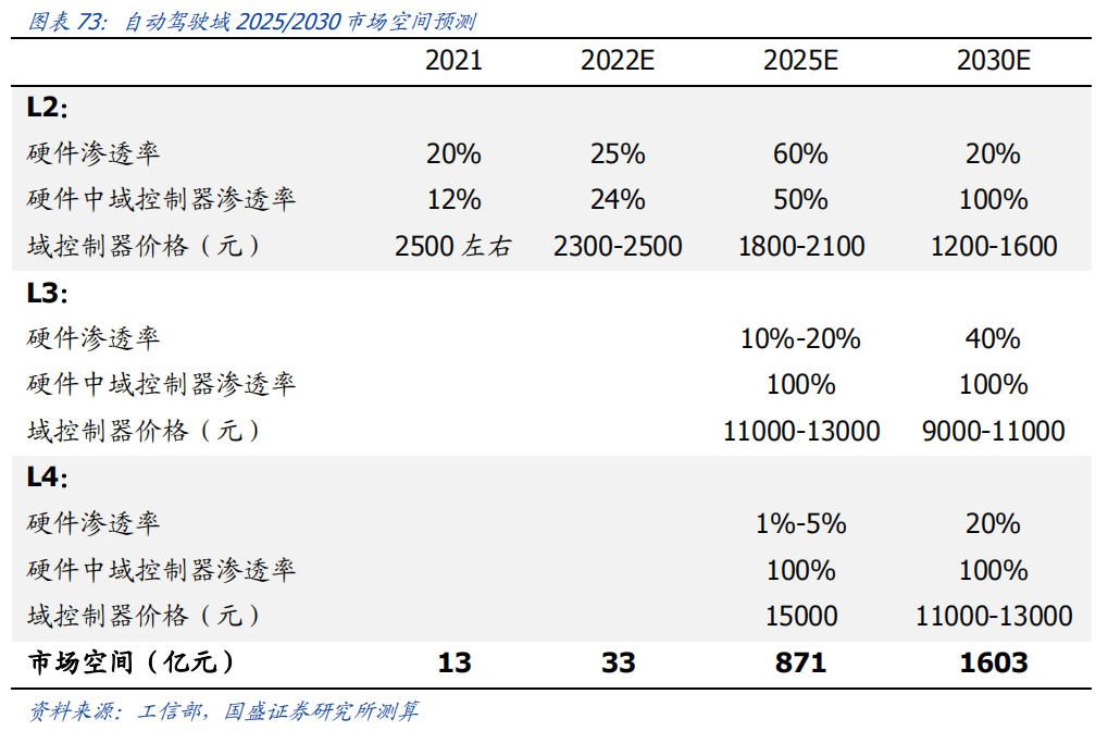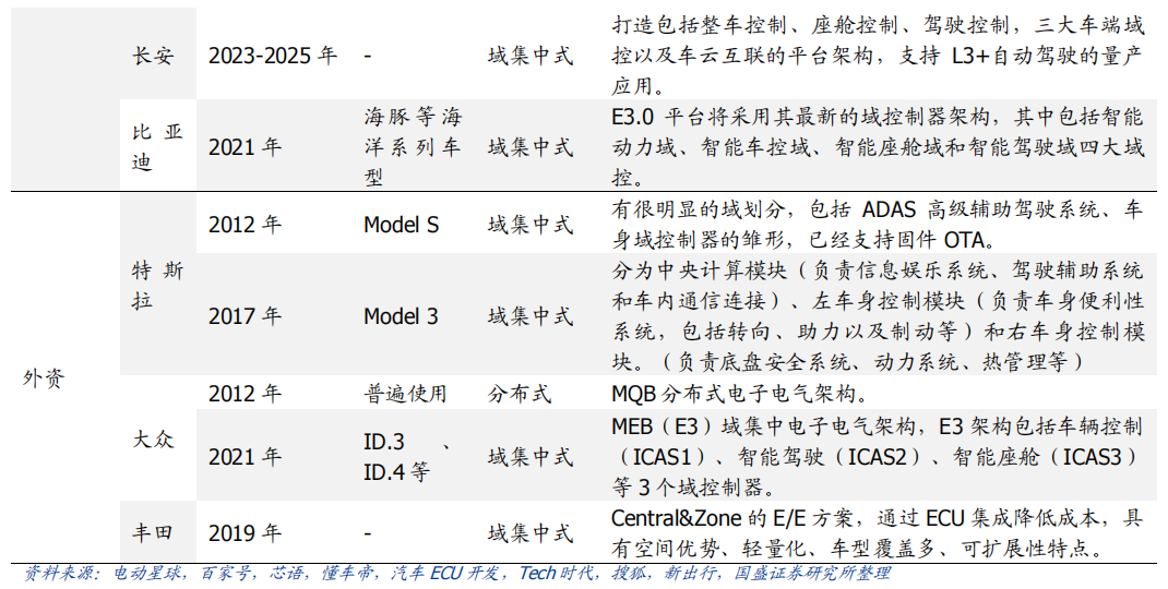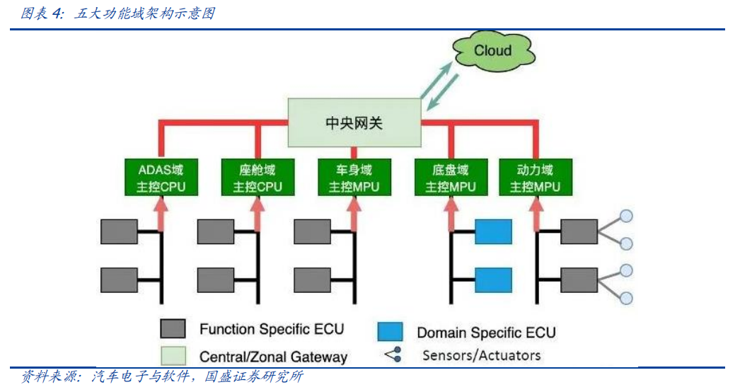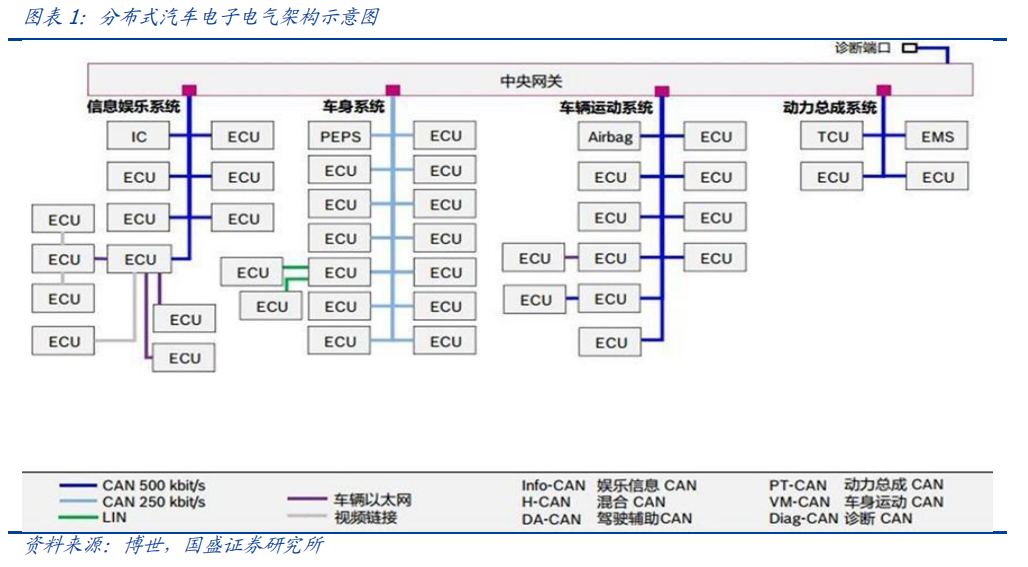 随着汽车智能化,网联化的渗透与普及,汽车电子电气零部件占汽车的比重也逐渐提高。高级驾驶辅助系统,车载多媒体娱乐系统等逐渐成为消费者关注且左右购买决策的功能配置。越发复杂的系统对传感器、电子控制器(Electronic Control Unit, ECU)的数量有了需求,如自动驾驶的摄像头,毫米波雷达,多媒体娱乐系统的副驾驶娱乐屏幕,HUD 抬头显示系统,控制发动机表现的 ECM 模块、管理新能源汽车电池的 BMS 模块以及用于 360 度环视影像融合计算的 AVM 模块等等。据焉知汽车数据,一辆现代豪华汽车中通常包含了70到100个ECU。传统的分布式电子电气架构(Electrical/Electronic Architecture, EEA)由于其:1. 算力分散无法高效利用 ;2. 线束成本重量劣势;3. 无法支持高带宽车内通信;4. 后续升级维护困难等多维度原因,已无法满足发展需求。集中式电子电气架构应运而生,并且在未来最终会走向中央计算平台的形式。分布式架构下汽车搭载数十个控制器,且为保证性能稳定性及安全性,每个控制器芯片硬件算力相对其上运行的程序都有所冗余。这就导致从整车维度,各个控制器的能力“各自为政”,无法高效协同。反之在集中式电子电气架构下算力在行车时为辅助驾驶服务,在驻车休息时可为车载游戏提供运行算力。庞大的 ECU 数量同样意味着复杂、冗长的总线线束。据电子工程世界网数据,一辆高级汽车的线束使用量约 2km,重量在 20~30kg。在线束中,线缆材料本身重量占到线束总重量的 75%左右。集中式的电子电气架构以及域控制器的引入,可极大的缩短线束的使用量。分布式 ECU 时代,计算和控制的核心是 MCU 芯片,传输的基础核心是基于传统的 CAN、LIN 和 FlexRay 等低速总线。随着 ECU的不断增多,导致总线负载增加,基本上达到允许的上限了,这样容易导致信号丢帧、总线堵塞等技术难题,从而导致安全隐患。但在域控制器时代,高性能、高集成度的异构芯片作为域的主控处理器,域内统一调度控制,域外通过以太网等进行高速通信。目前百兆和千兆的以太网已在多款新车型上得到应用。车载以太网每节点实施成本高于 CAN 、 LIN,与 FlexRay 相当。在未来,数据传输速度的制约将使得车载以太网替代传统总线成为必然。各个 ECU 开发主要由各 Tier1 提供主机厂,主机厂由内部团队进行集成整合。对主机厂集成开发能力,供应商管理能力提出了很高的挑战。此外,分布式的架构零散的 ECU 布局也难以支持车载软件在线升级(OTA),从而加大了软件后期维护迭代的难度。目前,OTA 已经从部分新势力车企的独门绝技,逐渐大众化,各个车企的更新迭代频率也在快速提升。据国家市场监督管理总局披露的数据,2021 年各大车企报告 OTA 升级 351 次,较 2020 年同期上升了 55%,而涉及到的车辆达到 3424 万辆之巨,更是较 2020 年同期暴增了307%。传统汽车的电子电气架构一般采用分布式,其控制中枢由电子控制单元ECU通过CAN总线和LIN总线连接,在传感器、电源及通信芯片、执行器等零部件的配合下,实现对汽车状态与功能的操控。每个控制系统采用单独的 ECU,不同的电控系统功能保持独立性,每增加一个功能就需要增加一个 ECU,因此传统汽车智能功能的增加和升级主要依赖于 ECU 和传感器数量的累加。在电子化和智能化发展的需要下,传统的分布式架构逐渐进化为域集中式架构,“域”和“域控制器”产生。域控制器最早由博世、大陆、德尔福等 Tier1厂商提出,通过利用处理能力更强的多核 CPU/GPU 芯片,引入以太网并将分散的 ECU 集成为运算能力更强的域控制器来相对集中地控制每个域,从而解决分布式架构存在的成本、算力等局限性。1)域集中式架构可以节约成本、降低装配难度。在分布式架构中,随着 ECU 数量增加产生的大量内部通信需求,导致线束成本增加并加大装配难度;而域集中式架构将传感与处理分开,传感器和 ECU 不再一对一,管理更便捷,有效减少了 ECU 和线束的数量,从而降低硬件成本和人工安装成本,同时更有利于部件布局。2)域集中式架构可以提高通信效率,实现软硬件解耦,便于整车 OTA 升级。分布式架构中,来自不同供应商的 ECU 的软件开发框架和底层代码不同,导致冗余,并提高维护和 OTA 统一升级难度;而域集中式架构做到对各 ECU 进行统一管理与信息交互,统一软件底层开发框架,从而便于未来的 OTA 升级和拓展功能的实现。3)域集中式架构能进一步集中算力,减少冗余。分布式架构中的各个 ECU 之间算力无法协同,相互冗余,产生极大浪费。而域控制架构将原本分散的 ECU 进行算力集中,统一处理数据,减少算力冗余,更能满足高阶自动驾驶对于算力的高要求。基于功能集中分区,博世等传统 Tier1将汽车电子控制系统分为动力域(安全)、底盘域(车辆运动)、座舱域(娱乐信息)、自动驾驶域(驾驶辅助)和车身域(车身电子)五域。动力域用于动力总成的优化与控制,同时兼具电气智能故障诊断、智能节电、总线通信等功能。动力域控制器是一种智能化的动力总成管理单元,借助 CAN/FLEXRAY 实现变速器管理,引整管理电池监控交流发电机调节。其优势在于为多种动力系统单元(内燃机、电动机发电机、电池、变速箱)计算和分配扭矩、通过预判驾驶策略实现 CO2减排、通信网关等,主要用于动力总成的优化与控制,同时兼具电气智能故障诊断、智能节电、总线通信等功能。底盘域将集成整车制动、转向、悬架