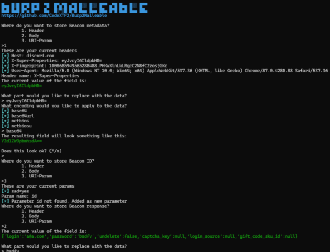 将来自 burp 套件的 HTTP 请求转换为 Cobalt Strike Malleable C2 配置文件。它允许您从 BurpSuite(或 ZAP、POSTMAN 等)获取您希望流量看起来/混合的内容的捕获/制作请求,并将它们转换为 CobaltStrike Malleable C2 配置文件。它允许运营商选择其数据的存储位置和格式,从而使流量看起来尽可能干净。pip install -r requirements.txt