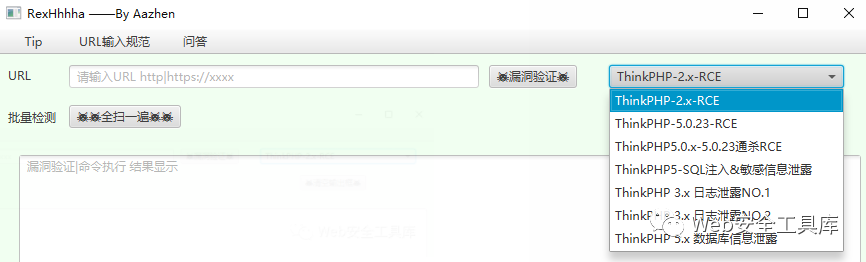 自研JavaFX图形化漏洞扫描工具,支持扫描的漏洞分别是:ThinkPHP-2.x-RCE, ThinkPHP-5.0.23-RCE, ThinkPHP5.0.x-5.0.23通杀RCE, ThinkPHP5-SQL注入&敏感信息泄露, ThinkPHP 3.x 日志泄露NO.1, ThinkPHP 3.x 日志泄露NO.2, ThinkPHP 5.x 数据库信息泄露的漏洞检测,以及批量检测的功能。漏洞POC基本适用ThinkPHP全版本漏洞。