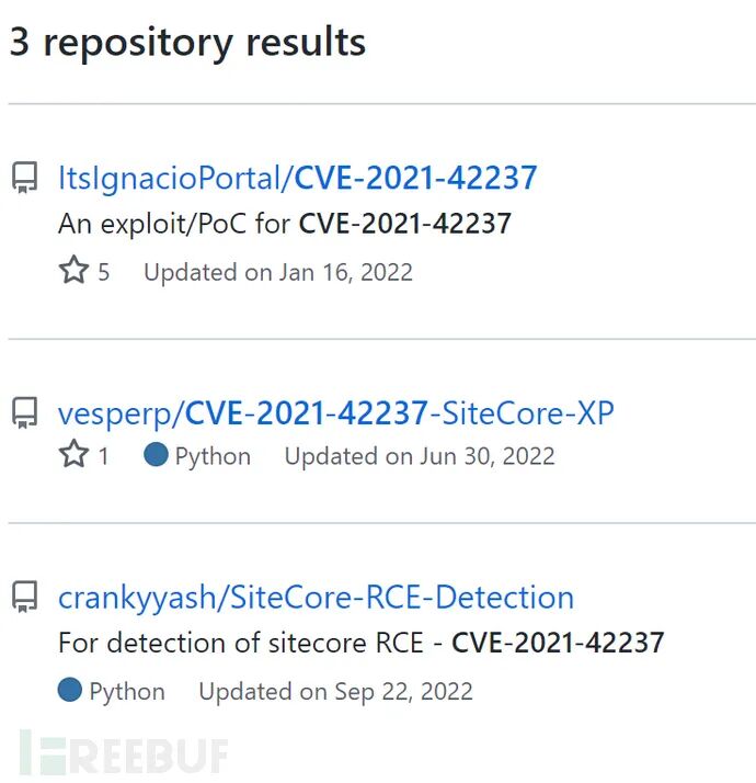 网上只找到一个CVE-2021-42237(Sitecore XP远程代码执行漏洞),找个POC试试: