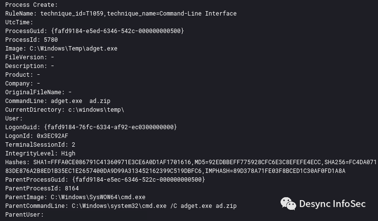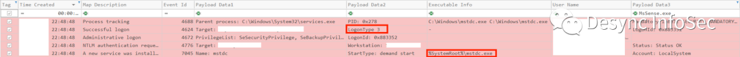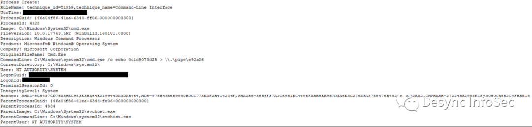 攻击者使用Cobalt Strike的Getsystem功能成功在两台失陷主机中提权,我们可以用过Sysmon的事件ID 1监测到进程的命名管道操作。
