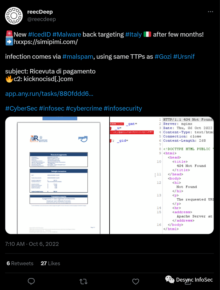 通过恶意文档的模板和C2服务器信息提取到的特征,我们发现这次入侵与已知的恶意邮件钓鱼活动有关,该活动针对意大利相关组织发起攻击。(https://twitter.com/reecdeep/status/1577979717717721088?s=20&t=QWDIpjACeLzPOEy4DDGnUQ)